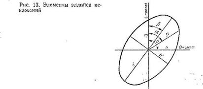 Показатель σ2 учитывает как искажения площадей, так и искажения форм (углов). Если его рассматривать как вектор в системе координат (рис. 11), то угол α = arctg(K—1)/(р—1), определяющий поворот этого вектора, характеризует соотношения искажений площадей и искажений углов: при α = 0 нет искажений углов, при отсутствии искажений площадей α = 90°; при α = 45° искажения форм и площадей уравновешены, т. е. К— 1—р—1- Наиболее полно все виды искажений в данной точке карты можно представить в виде эллипса искажений. Эллипс искажений в данной точке карты изображает бесконечно малый круг на поверхности относимости. Его полуоси равны величинам а' и b' они ориентированы по главным направлениям. Радиус-вектор эллипса искажений может быть ориентирован по любому направлению и определяет частный масштаб длин по этому направлению. Форма эллипса характеризует искажения углов и форм — они искажены тем больше, чем больше эллипс отличается от окружности. Площадь эллипса пропорциональна искажению площадей и тем она больше, чем больше искажены площади. Желая показать па карте эллипсы искажений, условно принимают радиусы бесконечно малых окружностей на шаре или эллипсоиде равными конечной величине (например, 5 мм в масштабе карты). Тогда все показываемые на карте эллипсы также примут конечные величины (рис. 12). Их можно сравнивать между собой и сопоставлять с показанными на карте, где нет искажений или отсутствует один из видов искажений. Величины и характер искажений, которые каждый эллипс демонстрирует, следует относить к точке карты, в которой находится центр эллипса. Определяя по карте или вычисляя по формулам частные масштабы длин по меридианам m и параллелям n и угол между ними θ, легко вычислить параметры эллипса искажений (рис. 13). Полуоси эллипса искажений а' и b' (для шара или эллипсоида вращения) находят по формулам