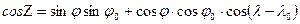 на рис. 15 изображены положения касательного цилиндра в цилиндрических проекциях. Конические проекции обычно применяют в нормальной ориентировке (рис. 16). В косых и поперечных проекциях картографические сетки отличаются от сетки нормальных проекций. В этих проекциях с нормальной сеткой схожи сетки вертикалов и альмукантаратов. Вертикалы и альмукантараты можно рассматривать как смещенные меридианы и параллели, получившиеся после перемещения географического полюса в положение Q (рис. 17), которое показано в косой ориентировке. В поперечной ориентировке полюс Q лежит па экваторе, а в нормальной —совпадает с географическим полюсом. Положение вертикала определяется азимутом а — двугранным углом между плоскостью меридиана полюса Q и плоскостью, проведенной через нормаль в точке Q в направлении на текущую точку С (см. рис. 17). Положение альмукантарата определяется зенитным расстоянием г, отсчитываемым от полюса Q до текущей точки С. Вертикалы— линии, для которых a = const, альмукантараты— линии, для которых z= const. После перемещения на поверхности относимости полюса Q в географический полюс вертикалы совпадают с меридианами, альмукантараты — с параллелями. В случае шара вертикалы —дуги больших кругов, альмукантараты — дуги малых кругов. Величины г, а называют полярными сферическими координатами. Переход от широт φ и долгот λ к азимутам A и зенитным расстояниям z осуществляется по формулам сферической тригонометрии: