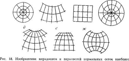 В нормальной ориентировке вспомогательные поверхности касаются эллипсоида или шара по какой-то параллели или пересекают их по двум параллелям. На этих параллелях сохраняется главный масштаб длин, и их называют главными параллелями. По виду нормальной картографической сетки прежде всего выделяют проекции, в которых параллели изображаются на плоскости линиями постоянной кривизны, т. е. прямыми линиями, окружностями или их дугами. Наиболее распространенные картографические проекции показаны на рис. 18: