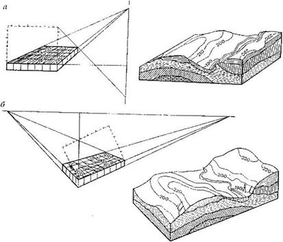 Рис. 76. Схема построения перспективной блок-диаграммы: а - с одной точкой перспективы; б— с двумя точками перспективы