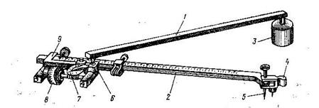 Рис. 80. Полярный планиметр: 1 — полюсный рычаг; 2 — обводной рычаг; 3 — конец полюсного рычага с грузом; 4 — ручка; 5 — острие обводного рычага; 6 — шарнир: 7 — циферблат счетного механизма; S — счетное колесо с верньером; 9 — каретка со счетным механизмом Измерения площадей по картам осуществляют с помощью планиметров, методом взвешивания и палетками разных конструкций. Планиметр — специальный прибор для определения по карте или плану площади участка местности. Наиболее употребителен полярный планиметр (рис. 80), состоящий из двух рычагов: полярного и полюсного, имеющих шарнирное соединение, и каретки со счетным механизмом. Конец полюсного рычага закрепляется неподвижно, а острием обводного рычага проводят по контуру измеряемой площади. Вначале обводное острие помещают в любую точку контура, а рычаги располагают под углом примерно 90° друг к другу. В этом положении берут начальный отсчет т1 по счетному механизму, затем обводят контур по ходу часовой стрелки и, возвратившись в ту же точку, берут второй отсчет т2. Площадь Р вычисляют по формуле Р = С(тг— т1), где С — цена деления планиметра, определяемая нз п промеров известной площади Р изв., например, нескольких километровых квадратов на топографической карте: