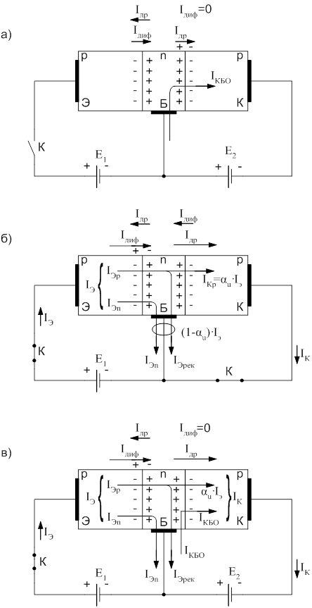 Рис.2.1 Токи в транзисторе при подключении источника: а - только коллекторного; б - только эмиттерного и при соединенииколлектора с базой; в - эмиттерного и коллекторного