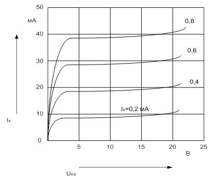 составлять десятки кОм.).Выходное сопротивление схемы с ОК наименьшее из всех схем включения VTа (десятки-сотни Ом.). Очевидно, что в данной схеме прирост падения напряжения на Rэ, то есть Uвых всегда меньше Uвх. Это означает, что схема с ОК не даёт усиления по напряжению. В то же время схема с ОК даёт усиление по току и мощности. Статические характеристики VT снимаются при отсутствии нагрузочного резистора (Rк=Rэ=0). Но в этом случае схема с ОК превращается в схему с ОЭ. Поэтому статические характеристики для схемы с ОК те же, что и для схемы с ОЭ.