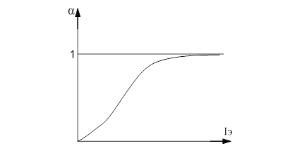 Рис. 3. - Зависимость коэффициента прямой передачи по току транзистора α от Iэ Еще одним конструктивным решением, позволяющим понизить коэффициент α, является шунтирование одного из эмиттерных переходов областью базы этого перехода. Действительно, при малых значениях тока Iэ сопротивление p – n – перехода еще велико по сравнению с объемным сопротивлением базы (рис.4), и ток Iэ пойдет в основном через базу, минуя p – n – переход. Когда же общее анодное напряжение повысится, ток Iэ повысится, потенциальный барьер на данном переходе за счет прямого напряжения на этом переходе скомпенсируется, сопротивление открытого эмиттерного перехода станет меньше объемного сопротивления базы, и ток пойдет через p – n – переход, а α повысится.