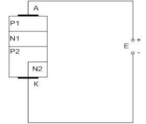 При подаче обратного напряжения в точки А – К переходы П1 и П3 окажутся под обратным напряжением, а П2 под прямым. В этом случае в цепи тиристора будет протекать очень незначительный ток неосновных носителей и общее сопротивление тиристора будет очень большим.