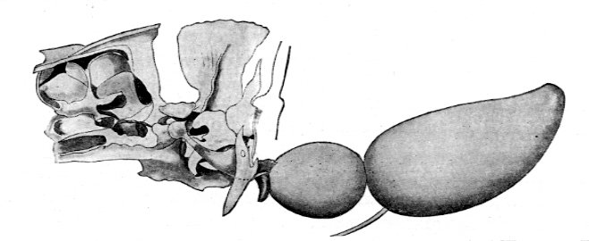 У карпа число позвонков 36-38. Из скелетных элементов первых четырех позвонков образовалась система косточек, входящая в состав веберова аппарата, являющегося одной из отличительных особенностей карпообразных. Веберов аппарат – это орган, передающий изменение давления внешней среды во внутреннюю полость. Он представляет собой орган, состоящий из скелетных элементов первых позвонков, эндолимфатической полости лабиринта, перилимфатического пространства слуховой капсулы и плавательного пузыря (рис. 50). Остистый отросток первого позвонка преобразован в одну из косточек веберова аппарата – запор (claustrum); верхняя дуга первого позвонка – в чашевидную (scaphium) косточку. Из верхней дуги второго позвонка образована вставочная косточка (incus), из поперечного отростка третьего позвонка – трехногая (tripus). Последняя косточка веберова аппарата (os suspensorium) развивается за счет ребер четвертого позвонка. Все косточки связаны друг с другом, а трехногая с помощью связки соединена с наружной стенкой плавательного пузыря. При изменении наружного давления пассивно изменяется объем воздушной камеры, что влечет за собой движение косточек аппарата; в связи с этим изменяется давление через пери- и эндолимфу на лабиринт; передаваемое раздражение вызывает в качестве рефлекса соответствующее изменение мышечного тонуса.