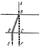 Естественный луч АВ разделяется в кристалле на два луча: BD и BC. Луч BD называется необыкновенным лучом, так как его показатель преломления зависит от направления распространяющегося луча, и, следовательно, в различных направлениях в кристалле он распространяется с различными скоростями. Луч ВС называется обыкновенным лучом, так как он подчиняется законам преломления, и скорость его в кристалле не зависит от направления (рис. 2).