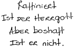 – Так, что у нас осталось? Возьмемся теперь за первую и третью. Эти две строки никак не поддавались расшифровке. После того как был перепробован целый ряд перестановок, Ариане пришлось попросить на ресепшн немецкий словарь, чтобы с его помощью отрабатывать новые версии. Они давно покинули ресторан и вернулись в бар, перетасовывая в разном порядке буквы и слоги, складывая из них слова и пытаясь скомпоновать их в значащие фразы. Под их напором шифр наконец стал понемногу выдавать свои секреты. В третьей строке Томашу и Ариане удалось обнаружить слово «aber», что и позволило им прийти к финальной формулировке. С победной улыбкой Ариана начертала на черновике расшифрованные строки четверостишия: