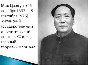 Деформация государственной системы периода «культурной революции» Уже в переходный период организация власти в КНР не исчерпывалась установленными законами институтами. Наряду с ними существовали (и в большинстве политических ситуаций доминировали) вн е к о н ституционные формы власти и, особенно, управления: система партийных учреждений во главе с ЦК КПК, его Секретариатом и Политбюро, и система военно-административных учреждений НОА, где большое значение имело не только Главное командование, но и провинциальные командующие группировками и армиями. Такой разрыв – между писаной и фактической конституциями – вообще характерен был для социалистического государственного уклада. В КНР он был особенно значительным в силу ряда традиционных особенностей и идейно-политического курса руководимой Мао Цзедуном КПК. Конец 1950-х гг. знаменовался существенной деформацией государственно-политических принципов Конституции 1954 г. и дальнейшим возобновлением фактической военно-партийной диктатуры. Исходя из декларированных Мао Цзедуном идей «нового курса» (предполагавшего т. н. «большой скачок» в экономике, разрыв отношений с СССР, превращение страны в военный лагерь для открытой борьбы с «мировым империализмом» и т. д.), КПК отказалась даже от условных форм «регулярной демократии», зафиксированной Конституцией, и перешла к прямому военно-бюрократическому управлению страной.«Большой скачок» В 1968 г. Мао Цзедун высказался за новую Конституцию, в которой не было бы места Председателю КНР и разным несоциалистическим институтам. С июня 1970 г. по август 1973 г. особая комиссия последовательно выработала два проекта. Второй из них был предложен созванному в конце 1974 г. ВСНП (до этого оно не созывалось с 1964 г.). Депутатский состав ВСНП не избирался, а был сформирован «на основе широких демократических консультаций», По рекомендации Пленума ЦК КПК ВСНП на сессии 13-17 января 1975 г. утвердило новую конституцию КНР.