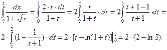 где Отметим, что применение метода подстановки даже несколько упрощается, так как нет необходимости возвращаться к первоначальной переменной в выражении, полученном для первообразной. Достаточно вычислить разность ее значений на верхнем и нижнем пределе изменения новой переменной. Пример 26.