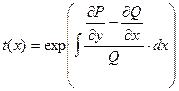 Для нахождения t(x; у) надо проинтегрировать полученное ДУ в частных производных. Решение этой задачи не простое. Нахождение интегрирующего множителя может быть упрощено, если допустить существование t как функции только одного аргумента х либо только у. Пусть, например, t = t(x). Тогда уравнение (4.23) принимает вид