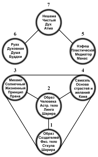 Леви называет Нэфеш то, что мы называем Манасом и vice versa. Нэфеш есть Дыхание (животной) Жизни в человеке – Дыхание Жизни, инстинктивное в животном; Манас есть Третья Душа – человеческая в ее светлом аспекте, и животная в связи с Самаэлем или Камою. Нэфеш действительно есть «Дыхание (животной) Жизни», которая была вдунута в Адама, человека из праха; следовательно это есть Жизненная Искра, одушевляющий Элемент. Без Манаса, «Разумной Души» или Ума, который в диаграмме Леви неправильно назван Нэфеш, Атма-Буддхи неразумна на этом плане и не может выявляться. Именно, Буддхи есть Пластический Медиатор, не Манас, являющийся разумным посредником между верхней Триадою и низшей Четверицею. Но много таких странных и любопытных превращений встречается в каббалистических трудах – убедительное доказательство тому, что эта литература стала прискорбной путаницей. Мы принимаем классификацию эту лишь в этом особом пункте, чтобы показать сходные точки. Теперь, мы представим в форме таблицы то, что осторожный Элифас Леви пишет, чтобы объяснить свою диаграмму и то, чему учит Тайная Доктрина – и сравним и то и другое. Элифас Леви делает также различие между каббалистическими и оккультными учениями о Духе.