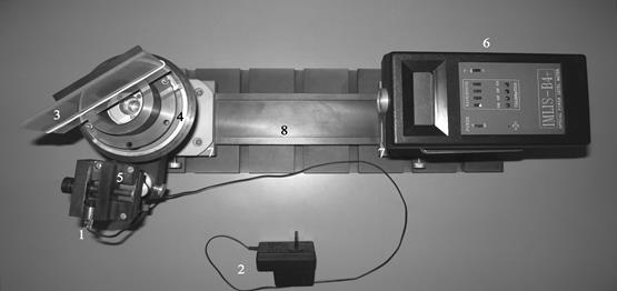 Симметричный нониус. Поляризация ┴. Поляризация ||. Здесь: 1 – излучатель полупроводникового лазера HLDPM10-650-3 (мощность излучения» 3 мВт и сечение пучка» 1´2 мм), – см. Приложение С; 2 – источник питания полупроводникового лазера; 3 – стеклянная плоскость 70´110´4 мм; 4 – гониометр для измерения угла поворота плоскости (буссоль БГ-1), в том числе а) стол поворотный (360°), б) крепление плоскости к поворотному столу, в) два устройства отсчета угла поворота стола (1° с нониусом). Лупа для наблюдения показаний гониометра на фотографии не показана; 5 – держатель лазерного излучателя поворотный (180°) с устройством разворота (360°) излучателя вокруг своей оси; 6 – измеритель мощности оптического излучения, в том числе а) входное окно диаметром 10 мм, б) цифровое табло для отсчета значений мощности засветки входного окна в относительных единицах, в) выключатель питания, г) переключатель постоянной времени измерений (при работе должен быть установлен в положение 1 с), д) четыре выключателя для селекции потребного спектрального диапазона, устанавливаемого преподавателем, – см. Приложение С; 7 – рейтеры с юстировочными приспособлениями; 8 – рельс. Измеритель мощности излучения может работать и от встроенного источника питания (аккумулятора), и от внешнего (сетевого адаптера). Последний на фотографии не показан.
