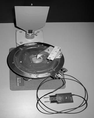 Рис. 5. Лабораторная установка для исследования дисперсии света Здесь: 1 – излучатель полупроводникового лазера HLDPM10-650-3 (мощность излучения 3 мВт и диаметр пучка 2 – источник питания полупроводникового лазера; 3 – трехгранная стеклянная призма; 4 – гониометр для измерения угла поворота призмы, в том числе а) держатель лазерного излучателя поворотный, б) стол поворотный с лимбом (360º), в) крепление призмы к поворотному столу, г) два устройства отсчета угла поворота стола (0,5º с нониусом); 5 – экран (на трех фото к нему магнитом прикреплена линейка в качестве визира). Лупа для наблюдения показаний гониометра на фотографии не показана.