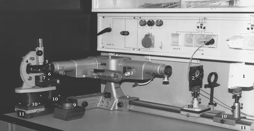 Здесь: 1 – протяженный источник света (вертикально расположенная галогенная лампа накаливания в металлическом кожухе с отражателем и выходным окном 70 2 – объектив (кварцевая линза диаметром 60 мм и фокусным расстоянием 100 мм); 3 – монохроматор УМ-2, в том числе а) вертикально расположенная регулируемая от 0 до 4 мм щель с отсчетным устройством (цена деления шкалы барабана 0,01 мм), б) входная (коллиматорная) труба, в) призменный стол под кожухом, г) барабан с устройством отсчета (0…3500 отн. ед.) угла поворота призменного стола либо длины волны монохроматического излучения, д) выходная труба, – см. Приложение C; 4 – микроскоп МБУ-4 для наблюдения интерференционной картины, в том числе а) штатный монокулярный тубус, б) окуляр 7× с визиром, в) объектив (линза f = 35 мм в резьбовой оправе), г) предметный столик, д) наводка на резкость (грубая), е) наводка на резкость (тонкая), ж) стойка, з) башмак, – см. Приложение C; 5 – полупрозрачное зеркало 55 6 – плоскопараллельная стеклянная пластинка 35 7 – двояковыпуклая стеклянная линза диаметром 36 мм; 8 – светопоглощающий экран; 9 – часовой индикатор для замера смещения интерференционной картины вправо и влево на ±5 мм; 10 – рейтеры с юстировочными приспособлениями; 11 – рельсы. Монохроматор на фотографии показан в той комплектности, в которой он используется в настоящей лабораторной работе.
