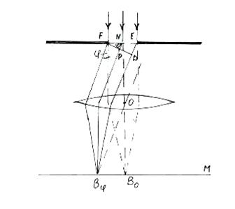 Рис. 3 Проведемо площину FD, перпендикулярну до напрямку діафрагованих променів. Розподіл фаз, який матиме місце на цій площині, визначає собою співвідношення фаз елементарних хвиль, що збираються в точці Вj, бо лінза не вносить додаткової різниці фаз. Отже, досить визначити різницю ходу, що виникає на шляху від площини FЕ до площини FD. З рис.3 видно, що різниця ходу між хвилями, які йдуть від елементарної зони при точці F (край щілини) і від будь-якої точки N (яка лежить на відстані х від краю щілини), є NP = x sin j. Світлове збурення в точці Р площини FD виразиться через