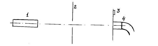 ОПИС УСТАНОВКИ Установка збирається за схемою рис.5. Квантовий генератор 1 установлюється на оптичній лаві так, щоб частина лави (не менше 1 м) залишалася вільною. На вільному кінці лави встановлюють два рейтери: один з тримачем для щілини 2, інший з змінним тримачем для матового екрана 3, а також для фотодіода 4. Тримач для щілини повинен мати пристрій для невеликого переміщення в поперечному напрямку при наладці установки.