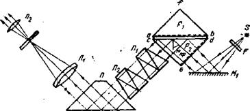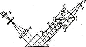 Рис. 2. Хід променів в рефрактометрі при вимірюванні показника заломлення рідини методом ковзного променя. Основною частиною рефрактометра є дві скляні прямокутні призми Ковзному променю в рідині Якщо світло, що виходе з грані Якщо джерело Для повороту призм навколо одна одної слугує спеціальна рукоятка і система конічних шестірень, за допомогою яких призми одночасно повертаються в протилежних напрямках. Повертаючи ручку компенсатора, слід досягти того, щоб границя світла і тіні в полі зору стала достатньо різкою. Положення границі при цьому відповідає довжині хвилі В деяких випадках, коли дисперсія рідини, що досліджується, особливо велика, діапазон компенсатора виявляється недостатнім і різкої границі отримати не вдасться. В даному випадку рекомендується встановлювати перед світильником жовтий світлофільтр. Поворотна призма (призма Дове), що застосовується в рефрактометрі, дозволяє зробити прилад більш компактним. На мал. 3 показаний хід променів в рефрактометрі при роботі по методу повного внутрішнього відбивання. В цьому випадку світло від джерела
