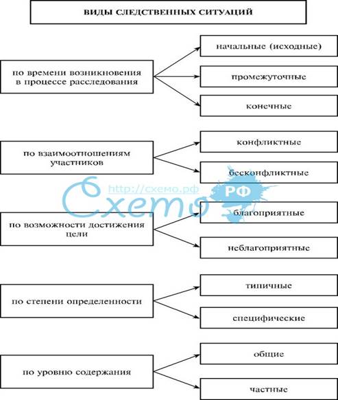 Можно выделить самые различные виды следственных ситуаций. Так, особый практический интерес представляет деление ситуаций на типовые и индивидуальные (конкретные). Конкретная следственная ситуация отражает индивидуальность и своеобразие того или иного момента расследования. В силу этого она включает в себя большое количество частностей: специфических, только ей присущих деталей и взаимосвязей. Вместе с тем в каждой ситуации обязательно присутствует ряд признаков, делающих ее похожей на другие ситуации такого же типа, то есть типовые. Следовательно, процесс выявления типовых ситуаций есть результат отвлечения от частностей, а его прикладное значение состоит в том, что типизация следственных ситуаций необходима для построения частных криминалистических методик. Кроме того, следственные ситуации можно разделить на ситуации расследования и ситуации отдельных следственных действий. Ситуации расследования характеризуют его состояние с позиций результативности проделанной работы к определенному моменту следствия. Ситуации следственных действий характеризуют обстановку в рамках конкретного следственного действия и, как правило, не детерминированы видом преступления. В зависимости от конкретного этапа расследования выделяют ситуации первоначального, последующего и заключительного его этапов. Для ситуаций первоначального этапа расследования характерны минимальный объем проделанной по уголовному делу работы и незначительное количество полученной информации. Анализ этих ситуаций в основном опирается на эвристическую деятельность следователя, в которой главное место занимает его способность анализировать, сопоставлять отдельные обстоятельства, прогнозировать направления расследования и т.д. Для промежуточных следственных ситуаций характерен некоторый объем проделанной работы и собранных доказательств, наличие определенной совокупности ориентирующей и доказательственной информации, раскрывающей отдельные стороны механизма преступления, позиции проходящих по делу лиц и т.д. Завершающие следственные ситуации позволяют следователю подвести итоги расследования, окончательно выстроить информационную модель расследуемого события, процессуальным образом отразить ее основные моменты в обвинительном заключении. В зависимости от возможностей достижения целей расследования ситуации могут быть благоприятные и неблагоприятные для следствия. Благоприятными принято считать ситуации, при которых достижение конечных целей расследования возможно при затрате минимальных усилий следствия. В свою очередь, неблагоприятные следственные ситуации характеризуются сложно преодолимыми препятствиями для расследования (например, отсутствие у следователя достаточной информации о преступлении, активное противодействие следствию со стороны заинтересованных лиц и т.д.). И, наконец, в зависимости от приоритетно решаемой в ситуациях задачи, их можно разделить на ситуации познавательного, организационно-управленческого типа, конфликтные ситуации и ситуации тактического риска. Анализ и оценка следственной ситуации имеет весьма существенное прикладное значение, поскольку способствует: • выдвижению обоснованных следственных версий, определению дальнейших путей расследования; • выбору оптимального сочетани