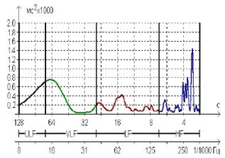 Рис. 3 Спектрограмма вариабельности сердечного ритма В западной литературе соответствующие спектральные компоненты получили названия высокочастотных (High Frequency – HF), низкочастотных (Low Frequency – LF) и очень низкочастотных (Very Low Frequency – VLF). По евро-американским рекомендациям (1996) предлагаются следующие диапазоны частот: высокочастотный диапазон (дыхательные волны) – 0,4–0,15 Гц (2,5–6,5 сек); низкочастотный диапазон (медленные волны 1-го порядка) – 0,15–0,04 Гц (6,5–25 сек); очень низкочастотный диапазон (медленные волны 2-го порядка) – 0,04 –0,003 Гц (25 – 333 сек). При спектральном анализе обычно для каждого из компонентов вычисляют абсолютную суммарную мощность в диапазоне, среднюю мощность в диапазоне, значение максимальной гармоники и относительное значение в процентах от суммарной мощности во всех диапазонах (Total Power-TP). При этом ТР определяется как сумма мощностей в диапазонах HF, LF и VLF. По данным спектрального анализа сердечного ритма вычисляются следующие показатели: индекс централизации – ИЦ (Index of centralization, IC=(HF+LF)/VLF) и индекс вагосимпатического взаимодействия LF/НF.