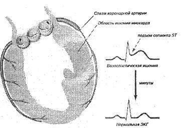 ]! Рис. 9. ЭКГ при вазоспастической стенокардии (Принцметала). tf Таким образом, роль фиксированной и динамической коронар-S ной обструкции в возникновении стенокардии сомнений не вызы-| вает. Однако далеко не всегда в клинике можно с полной уверенностью оценить вклад каждого из утих компонентов в вознпкно-- вение транзнторной ишемии миокарда. Классическим примером вазоспастической ишемии является стенокардия Принцметала, фиксированной коронарной обструкции - стенокардия напряжения с не-; изменяющимся порогом толерантности к физической нагрузке. В то же время даже у одного и того же больного с классической стенокардией напряжения возможны периоды течения заболевания, когда толерантность к физической нагрузке (результаты пробы с физической нагрузкой) существенно колеблется в течение одних суток. По-видимому, у этих пациентов иазоспастпческин компонент участвует в патогенезе ишемии, возникающей при физической нагрузке. Наконец, существует еще одна форма стенокардии, патогенез которой до настоящего времени не выяснен, - так называемый синд-ром-Х. Его особенностью является возникновение типичных ангинозных приступов у больных с интактными, по данным коронаро-графии, коронарными артериями. Предполагается, что возникновение стенокардии у этих больных обусловлено временными нарушениями кровообращения на уровне микроциркуляторного русла. Для стенокардии достаточно характерно волнообразное течение. Даже у одного и того же больного периоды относительно спокойного течения могут сменяться дестабилизацией процесса с увеличением числа и интенсивности приступов. В соответствии с этим принято различать стабильную и нестабильную стенокардию. К нестабильной стенокардии относят впервые возникающую стенокардию (в течение первых 4 нед с момента появления приступов), прогрессирующую стенокардию на фоне предварительно стабильного течения и стенокардию, возникающую после инфаркта миокарда. Дестабилизация течения стенокардии обычно бывает связана с обострением течения атеросклероза (быстрое формирование новых бляшек, изменения состояния предсуществовавших бляшек - их рост, надрывы покрышки, кровоизлияния в бляшку). Коронаро-ангиоскопические исследования в этот период нередко выявляют в местах атеросклеротических бляшек свежие тромбы, которые достаточно быстро лизируются. Выделение нестабильной стенокардии оправдано в клиническом плане, поскольку эти больные являются угрожаемыми в плане возможного развития у них инфаркта миокарда и внезапной смерти. Острая коронарная недостаточность (острая очаговая дистрофия миокарда, промежуточный коронарный синдром) Под острой коронарной недостаточностью (острой очаговой дистрофией миокарда) понимают болевой синдром, обусловленный ишемией миокарда, продолжающийся около 30 мин и сопровождающийся изменениями ЭКГ (депрессия или подъем сегмента ST), которые исчезают через сутки после болевого приступа. У многих больных из-за появления дистрофических изменений кардиомиоци-тов в зоне ишемии возможно повышение в крови активности ферментов и миоглобина, не превышающее 50% по отношению к верхней границе нормы. По патогенезу и клиническим проявлениям она занимает промежуточное положение между стенокардией и инфарктом миокар- да. В ее развитии могут иметь значение как вазоспазм, так 