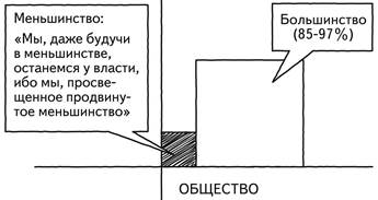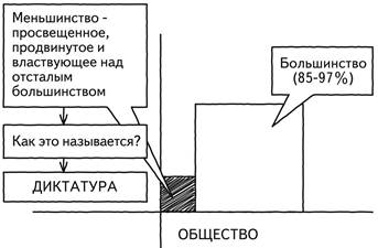 Рис. 3 Ответ, более или менее явный, таков: «А раз так, то мы, даже будучи в меньшинстве, останемся у власти, ибо мы – просвещенное, продвинутое меньшинство. И наша просвещенность и продвинутость дает нам на это право. А также дает нам на это право ваша дикость и непродвинутость как большинства». Итак, меньшинство – это продвинутое, просвещенное меньшинство, властвующее над отсталым большинством. Теперь мы спрашиваем спокойно это меньшинство и самих себя, а также всех, кого это интересует: «Как это называется? Вот это всё вместе – как называется? Когда просвещенное, продвинутое меньшинство властвует над отсталым и идиотическим большинством – как это называется?» Ась? Не слышу! (рис. 4)