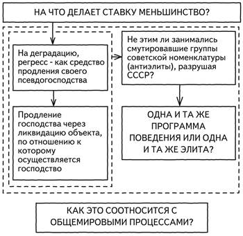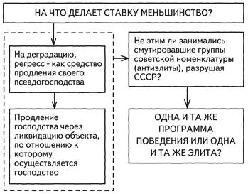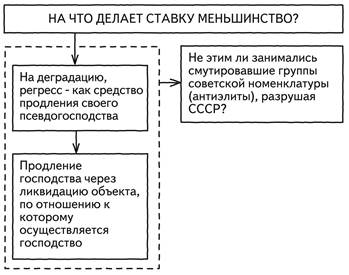Рис. 7 Я снова говорю: почему нормальная, сколь угодно свирепая элита никогда не допустит регресс собственного общества? Сколь угодно свирепая, подчеркиваю. Потому что нормальной элите государство необходимо для выигрыша в конкуренции с другими элитами! А здесь это не нужно. Вот та тайна, которая маячит за фасадом происходящего, за всеми парадными утверждениями и которую все время пытаются скрыть. Снова спрашиваю: на что делает меньшинство ставку? Внимание! Это очень важно сформулировать четко и осознать в полной мере. Первое. Очевидно, что ставка делается на деградацию и регресс как средства продления своего псевдогосподства. Продление господства через ликвидацию объекта, по отношению к которому осуществляется господство. Это и есть то, что я назвал «мутация», «паразитарность», «превращенная форма». Это свойство нашего правящего класса. Второе. Как только мы это обнаруживаем, мы спрашиваем себя: а не этим ли занимались мутировавшие группы советской элиты (а точнее, антиэлиты), разрушая СССР? Не этим ли они занимались? (рис. 8)
