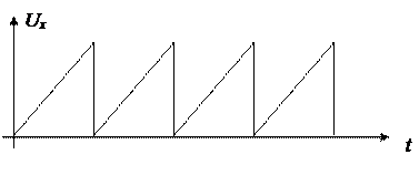 ЭЛТ (рис.1) включает: 1) стеклянный баллон, в котором создан глубокий вакуум; 2) «электронную пушку» (подогреваемый катод); 3) две пары отклоняющих пластин, расположенных во взаимно-перпендикулярных направлениях; 4) экран, покрытый люминесцирующим составом (веществом, которое светится при попадании в него электронов). Принцип работы ЭЛТ состоит в следующем. Электроны, испускаемые подогреваемым катодом, под действием электрического поля между катодом и анодом проходят сквозь управляющую сетку и кольцевой анод. Для фокусировки электронного луча на сетку подается небольшой отрицательный потенциал (от –20 до –70 В). Разность потенциалов между катодом и анодом может достигать нескольких тысяч вольт. Изменяя эти потенциалы, можно регулировать фокусировку и яркость свечения экрана (светового «пятна») в точках попадания в него электронного луча. При своём движении электронный луч проходит две пары отклоняющих пластин. Горизонтально расположенные пластины служат для отклонения луча в вертикальном направлении и называются вертикально отклоняющими пластинами. Вторая пара пластин служит для отклонения луча в горизонтальном направлении и называется горизонтально отклоняющими пластинами. При подведении к двум параллельным пластинам электрического напряжения между пластинами возникает электрическое поле, под действием которого изменяется направление движения электронов. Это позволяет перемещать электронный луч по экрану под действием напряжения, приложенного к отклоняющим пластинам электронно-лучевой трубки. Величина отклонения электронного луча, зависящая от скорости движения электронов и от величины приложенного к пластинам напряжения, определяется чувствительностью g осциллографа. Чувствительность осциллографа есть отношение разности потенциалов на отклоняющих пластинах к величине отклонения светящегося пятна на экране.