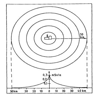 Технические источники Речь идет о светящихся красках в часах и прочих приборах, светящихся в темноте стрелочных индикаторах, урансодержащих глазурях изразцов и изделий из фарфора, дымовых детекторах на основе источников ионизирующего излучения, калильных сетках газовых ламп, уровнемерах, сварочных электродах, электрокардиостимуляторах, телевизорах и т.д. Однако излучение от них, отнесенное ко всему населению, очень мало – менее 0.01 мЗв в год, и составляет примерно одну двадцатую естественной дозовой нагрузки. Лишь неправильное использование таких аппаратов и материалов может привести к дозе, сопоставимой с естественной (2 мЗв в год). Такую дозу получают только те лица, кто по долгу профессии постоянно имеет дело с ними. Особый интерес представляет оценка дозы от телевизоров (с лучевыми трубками): кинескоп порождает электромагнитное излучение, которое соответствует очень слабому рентгеновскому излучению с малой энергией. За тысячу часов, проведенных в кресле перед телевизором на расстоянии 2,5 метра от него, эквивалентная доза составит только 0,00006 мЗв в год. Примерно в три раза выше оказывается мощность излучения от ящика пива на расстоянии одного метра от этого кресла. Оно испускается бутылочным стеклом, содержащим калий и уран, и исходит с примерно равной силой практически от любой стеклопосуды, в том числе от оконных стекол. На сегодняшний день электронно-лучевые трубки телевизоров в значительной мере заменены плоскими экранами, которые не генерируют вообще никакого рентгеновского излучения. Излучение и выбросы атомных электростанций и прочих ядерных объектов при нормальном режиме работы также вносят вклад в искусственную дозовую нагрузку. К таким предприятиям относятся также предприятия по добыче урановой руды, обогащению урана и изготовлению топливных элементов для реакторов. В этом случае суммарная доза среди населения распределяется еще более неравномерно, чем в случае с медициной. Заметному облучению подвержены только те лица, которые пребывают вблизи ядерных объектов. Установлены максимальные значения мощности дозы излучения, которые не должны превышаться даже при неблагоприятных обстоятельствах. Они находятся ниже средней дозы общего облучения от естественных источников. При нормальном функционировании предприятия фактические выбросы, в общем, на порядок ниже допустимых пороговых значений. На рис. 6 показана атмосферная дозовая нагрузка в радиусе 50 км от атомной электростанции, полученная в результате теоретических расчетов при допущении, что в центре объекта доза является максимально допустимой – 0.3 мЗв в год.