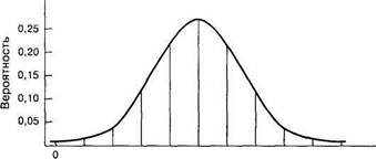 образную» форму (см. рис. 5.1). Форма таких распределений может быть описана математической формулой, которую предложил еще в XVIII веке математик де Муавр. Де Муавр решал следующую задачу. Предположим, монета в азартной игре подбрасывается 10 раз, и каждый раз она может с равным успехом выпасть «орлом» или «решкой». Какова вероятность того, что в результате этой игры выпадет 0 «орлов», или 1 «орел»,..., 10 «орлов»? Сложные вычисления дают математически точное решение такой задачи (рис. 5.2). А если игра состоит из 100 подбрасываний монеты, или 1000? Де Муавру удалось доказать, что уравнение кривой, соединяющей вершины отрезков на рис. 5.2, для данного случая или для любой другой подобной задачи имеет следующую формулу: