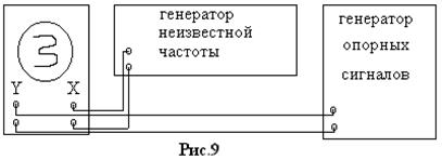 Ручки управления установить в следующие положения: “яркость” - в крайнее правое положение; “фокус” - в среднее положение; “усиление У”, “усиление Х” - в крайнее правое положение; ручки смещения луча “смещ. У”, “смещ. Х” - в среднее положение; переключатель “диапазоны” - в положение “30”; ручку “синхронизация” - в положение “внутр.”; ручку “ослабление” - в положение “1:1”. Тумблер выключателя сети установить в положение “Вкл.”, при этом должна загореться сигнальная лампочка. Через 1-3 мин. после включения осциллографа на экране должен появиться яркий горизонтальный штрих. Ручками “смещ. У”, “смещ. Х” установить изображение в центре экрана, ручкой “фокус” установить четкое изображение, уменьшая при необходимости яркость штриха. Соединить проводником гнездо “контр. сигнал” с зажимом “вход У” (на передней панели). Ручками “усиление У” и “усиление Х” установить на экране величину изображения, удобную для рассмотрения (от 2 до 8 делений масштабной сетки). Ручкой “частота плавно” установить такую частоту развертки, чтобы на экране установился один или несколько периодов колебаний. Вращая ручку “синхронизация усиления”, установить неподвижное изображение правильной синусоиды. Осциллограф готов к работе. В работе исследуется схема, изображенная на рис. 9. Генератор неизвестной частоты связан с “входом Х”; на шкале генератора неизвестной частоты fx имеются отметки частот f1, f2, f3, f4 и т. д., которые необходимо определить в процессе исследования с помощью метода фигур Лиссажу. Поскольку в данной работе не предусмотрено применение специальных схем синхронизации работы двух генераторов, то фазы опорного сигнала и сигнала неизвестной частоты постоянно меняются. В связи с этим разность фаз между сигналами постоянно изменяется. Изменения разности фаз приводит к изменению вида фигуры Лиссажу при одних и тех же отношениях частот. Изменения фазы сигнала проявляется в том, что на экране осциллографа фигура Лиссажу непрерывно меняет форму, в связи с чем создается впечатление, что фигура Лиссажу перемещается по экрану. По форме фигуры Лиссажу может быть определена разность фаз между сигналами.