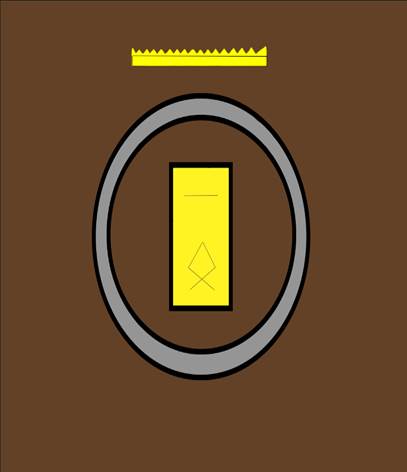 Расшифровка: Золотой прямоугольник - обозначает слиток золота. Высеченный на нём знак обозначает элементаля земли. Так люди царства Земли показывают величие золота. Существует реальный рунный знак – Отава. Который обозначает дьявола.