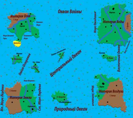 Океаны: Центральный Океан – В центре карты; Океан Островов – Между островом Металла и островом Немагов; Океан Войны – Между материком Огня и материком Воды; Восточный Океан – Возле острова Луны; Природный Океан – Возле острова Природы;