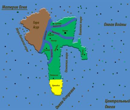Океаны: Океан Островов – К югу от Оркендола; Центральный Океан – К востоку от Океана Островов; Океан Войны – К востоку от Моря Войны;
