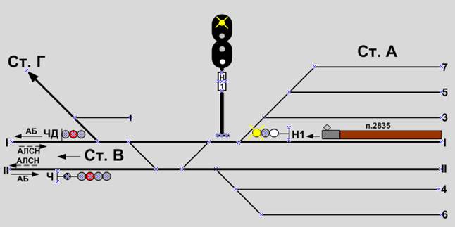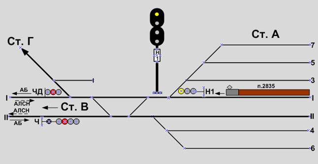 Наименование вопроса: «ИСИ_3_12_В-3» Группа вопроса: 1. Текст вопроса: «На перегоне А – Г – двусторонняя автоблокировка. На перегоне А – В движение поездов осуществляется по правильному пути по сигналам автоблокировки (АБ), а по неправильному пути – по сигналам локомотивных светофоров (АЛСН). Куда отправляется поезд № 2835 со станции А? » Картинка к тексту вопроса: