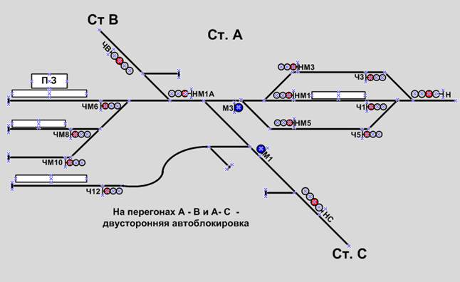 Варианты ответов: 1. НМ1А, НМ1, НМ3, НМ5, Н, НС, ЧВ. Признаки варианта ответа: правильный. 2. Н, НС, ЧВ. Признаки варианта ответа: неправильный, критический. 3. ЧВ, Н, НС, ЧМ6, ЧМ8, ЧМ10. Признаки варианта ответа: неправильный, критический. 4. НМ1, НМ3, НМ5, Н, НС, ЧВ. Признаки варианта ответа: неправильный, критический. Узкое место: ИСИ Глава 3; ИДП Прил.9 пп.30, 32, 34. Комментарии к неправильным ответам: Ответ неправильный. Указанным порядком принимаемые на станцию поезда могут проследовать все входные и маршрутные (по приему) светофоры. В заданной ситуации – это входные Н, НС, ЧВ и маршрутные НМ1, НМ3, НМ5 и НМ1А (маршрутный по приему на 6, 8, 10 пути, совмещенный с выходным на станцию В).