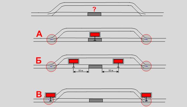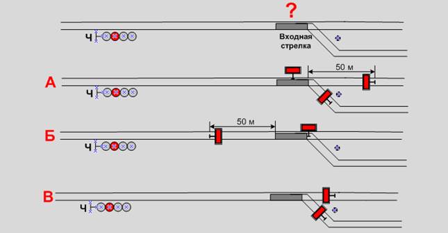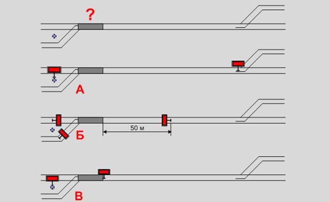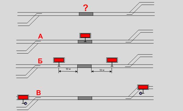 Варианты ответов: 1. Вариант А. Признаки варианта ответа: правильный. 2. Вариант Б. Признаки варианта ответа: неправильный, критический. 3. Вариант В. Признаки варианта ответа: неправильный, критический. Узкое место: ИСИ Глава 4 п. 42. Комментарии к неправильным ответам: Ответ неправильный. Заезд подвижного состава на ограждаемый путь невозможен ввиду изолирующего положения стрелок (в котором они закреплены или заперты). Поэтому переносной красный сигнал устанавливается только на месте препятствия (см. ИСИ, п. 42, рис. 98).