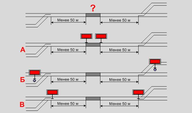 Варианты ответов: 1. Вариант А. Признаки варианта ответа: неправильный, критический. 2. Вариант Б. Признаки варианта ответа: неправильный, критический. 3. Вариант В. Признаки варианта ответа: правильный. Узкое место: ИСИ Глава 4 п. 33, 43. Комментарии к неправильным ответам: Ответ неправильный. В соответствии с пунктом 43 главы 4 ИСИ (рис. 106), место, требующее уменьшения скорости, расположенное на главном пути, ограждается по варианту В, если расстояние от сигнального знака «Начало опасного места» до входного светофора равно А и более (см. пункт 33 главы 4 ИСИ).