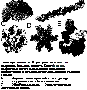 Живые организмы отличаются от неживых прежде всего тем, что они движутся и выполняют «работу» — дышат, переваривают пищу, сокращают мышцы и т. д. Чтобы понять природу жизни, нам необходимо разобраться, что приводит в движение белковые «машины». Окончательная форма, которую принимает белковая молекула (ее конформация, как говорят биологи), определяется равновесным расположением электрических зарядов в ее аминокислотной цепи. Если распределение положительных и отрицательных зарядов в молекуле белка изменится, она тут же примется выгибаться и приспосабливаться к новой ситуации. Распределение зарядов в белковой молекуле может быть избирательно изменено целым рядом процессов, в частности присоединением других молекул или химических групп (например, гормонов) и даже воздействием внешних электромагнитных полей — скажем, тех, что излучаются мобильными телефонами [Tsong 1989]. Конструктивное совершенство трансформирующихся белков поистине впечатляет: их точнейшим образом выверенная трехмерная конфигурация дает им возможность связываться с другими белками. Когда белковая молекула встречается с другой белковой молекулой, физически и энергетически ей комплементарной, они соединяются примерно так же, как хорошо подогнанные шестеренки в часах. Рассмотрим еще две иллюстрации. На первой показаны пять белковых молекул — своего рода молекулярные «шестеренки» клеток. Эти органические «шестеренки» имеют более мягкие края, чем их механические аналоги, но благодаря своей точно выдержанной трехмерной конфигурации могут надежно сцепляться с другими, комплементарными им белковыми молекулами.