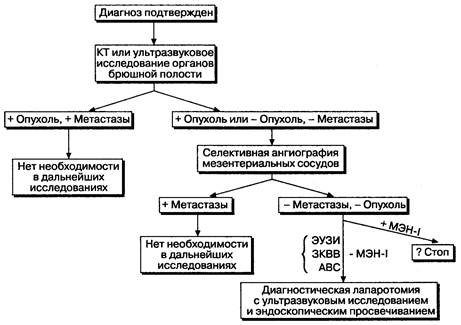Рис. 3-7. Диагностический план обследования больных с синдромом Золлингера-Эллисона. ЭУЗИ — эндоскопическое ультразвуковое исследование; ЗКВВ — забор крови из воротной вены; АВС — артериальное введение секретина. (По: Yamada Т., Alpers D. H., Owyang С., Powell D. W., Silvcrstein F. E., eds. Textbook of Gastroenterology, 2nd ed. Philadelphia: J. B. Lippincott, 1995:1436.)