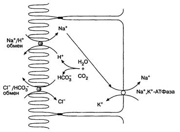 Содержимое тонкой кишки становится изоосмотичным прежде всего за счет двунаправленного перемещения как воды, так и электролитов. Выравнивание осмолярности обычно происходит в двенадцатиперстной кишке, поскольку объем химуса, поступающего туда одномоментно при нормальной работе желудка, небольшой. Если желудок опорожняется ненормально и в двенадцатиперстную кишку поступают большие объемы гиперосмотичного химуса, то в этом случае изоосмотичность в двенадцатиперстной кишке не может быть достигнута. Поскольку вода пассивно проходит в сторону гиперосмотичности, жидкость выходит из плазмы через ворсинки и поступает в просвет кишки. Значительный выход жидкости может привести к гиповолемии и вегетативным реакциям в виде тахикардии и потливости, что является признаками демпинг-синдрома. Главным механизмом абсорбции воды, электролитов и многих органических молекул является Na+,K+-ATФaзa, локализованная на базолатеральных участках мембран энтероцитов. Этот механизм транспорта требует затраты энергии АТФ и присутствия ионов магния для обмена трех ионов натрия, выходящих из клетки, на два иона калия, входящих в клетку. Поскольку суммарно клеткой теряются положительно заряженные ионы, электрический потенциал клетки относительно внеклеточной среды становится отрицательным. Na+,K+-ATФaзa создает градиент натрия, способствующий вхождению натрия обратно в клетку. Поэтому существует много веществ, транспортирующихся в клетку вместе с натрием: глюкоза, аминокислоты, ди- и трипептиды, соли желчных кислот. Для транспорта каждого из этих веществ необходим свой собственный белок-переносчик. Наличие ионов натрия значительно улучшает всасывание глюкозы; с другой стороны, глюкоза усиливает всасывание ионов натрия. На апикальном участке мембраны существуют также Nа+,Н+-антипорт и Сl~,НСО3–-антипорт (рис. 6-13). Благодаря этим белкам, Na+ и Сl– поступают в клетку, тогда как ионы водорода и бикарбонат выходят из клеток. Н+ и НСО3– образуются в клетке под действием карбоангидразы из СО2. Вода перемещается вслед за натрием пассивно: сначала в клетку, а затем из клетки в плазму крови.