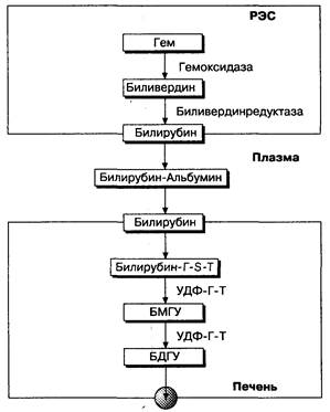 Желтуха проявляется желтой окраской кожи, слизистых оболочек, мочи и полостных жидкостей при участии билирубина. Для правильной дифференциальной диагностики желтух необходимо знать фундаментальные физиологические основы образования и экскреции билирубина. Билирубин образуется при разрушении гема (рис. 7-3): примерно 80 % — при разрушении гема эритроцитов, 20 % — при разрушении других гемопротеинов, таких как миоглобин, тканевые цитохромы. Микросомальный фермент — гемоксигеназа — превращает гем в биливердин, который под действием биливердинредуктазы превращается в билирубин. Образовавшийся в результате этих реакций неконъюгированный билирубин транспортируется кровью при помощи альбумина. Вытеснение лекарственными препаратами билирубина из связей с альбумином у новорожденных приводит к диффузии неконъюгированного билирубина через гематоэнцефалический барьер и к билирубиновой энцефалопатии или к истинной желтухе. Неконъюгированный билирубин поступает в печень, где из него образуется конъюгированный водорастворимый билирубиндиглюкуронид. Этот процесс облегчает экскрецию конъюгированного билирубина в желчь и катализируется микросомальным ферментом UDP-глюкуронилтрансферазой.