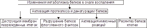 Рис. 5–5. Изменения метаболизма белков в очаге воспаления. • Деструкция мембран клеток, повреждённых флогогенным фактором. • Разрушение белковых структур и клеток флогогенного агента, когда им являются микроорганизмы, одно‑ и многоклеточные паразиты, а также — белоксодержащие факторы (вирусы, АТ, комплексы Аг‑АТ, токсины и другие соединения). • Активация иммунных (в том числе — иммунопатологических) реакций в связи с денатурацией белков как собственных погибших клеток, так и флогогенного агента. Включение клеточных и гуморальных механизмов иммунитета обеспечивает обнаружение, деструкцию и элиминацию антигенно чужеродных структур. • Продукты протеолиза служат субстратом синтеза новых клеточных компонентов взамен повреждённых.