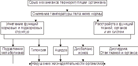 Стадия декомпенсации (деадаптация) процессов терморегуляции является результатом срыва центральных механизмов регуляции теплового обмена (рис. 6–12). Ы ВЁРСТКА вставить файл «ПФ Рис 06 12 Основные патогенные факторы гипотермии на стадии декомпенсации»