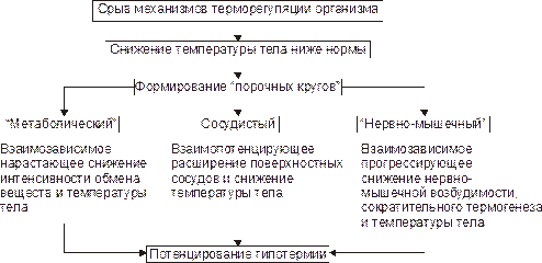 Рис. 6–13. Основные порочные круги на стадии декомпенсации системы терморегуляции при гипотермии. ‡ Метаболический порочный круг. Снижение температуры тканей в сочетании с гипоксией тормозит протекание метаболических реакций. Известно, что уменьшение температуры тела на 10 °C снижает скорость биохимических реакций в 2–3 раза (эта закономерность описывается как температурный коэффициент вант Хоффа — Q10). Подавление интенсивности метаболизма сопровождается уменьшением выделения свободной энергии в виде тепла. В результате температура тела ещё более снижается, что дополнительно подавляет интенсивность метаболизма и т.д. ‡ Сосудистый порочный круг. Нарастающее снижение температуры тела при охлаждении сопровождается расширением артериальных сосудов (по нейромиопаралитическому механизму) кожи, слизистых оболочек, подкожной клетчатки. Этот феномен наблюдается при температуре тела, равной 33–30 °C. Расширение сосудов кожи и приток к ним тёплой крови от органов и тканей ускоряет процесс потери организмом тепла. В результате температура тела ещё более снижается, ещё в большей мере расширяются сосуды, теряется тепло и т.д. ‡ Нервно ‑ мышечный порочный круг. Прогрессирующая гипотермия обусловливает снижение возбудимости нервных центров, в том числе контролирующих тонус и сокращение мышц. В результате этого выключается такой мощный механизм теплопродукции как мышечный сократительный термогенез. В результате температура тела интенсивно снижается, что ещё более подавляет нервно‑мышечную возбудимость, миогенный термогенез и т.д. ‡ В патогенез гипотермии могут включаться и другие порочные круги, потенцирующие её развитие. † Углубление гипотермии вызывает торможение функций вначале корковых, а в последующем и подкорковых нервных центров. В связи с этим у пациентов развивается гиподинамия, апатия и сонливость, которые могут завершиться комой. В связи с этим нередко в качестве отдельного этапа гипотермии выделяют стадии гипотермического «сна» или комы. † При выходе организма из гипотермического состояния в последующем у пострадавших нередко развиваются воспалительные процессы — пневмония, плеврит, острое респираторные заболевания, цистит и др. Указанные и другие состояния являются результатом снижения эффективности системы ИБН. Нередко выявляются признаки трофических расстройств, психозов, невротических состояний, психастении. • При нарастании действия охлаждающего фактора наступает замерзание и смерть организма. † Непосредственные причины смерти при глубокой гипотермии: прекращение сердечной деятельности и остановка дыхания. Как первое, так и второе в большей мере являются результатом холодовой депрессии сосудодвигательного и дыхательного бульбарных центров. † Причиной прекращения сократительной функции сердца является развитие фибрилляции (чаще) или его асистолия (реже). † При преимущественном охлаждении области позвоночника (в условиях длительного нахождения в холодной воде или на льду) смерти нередко предшествует коллапс. Его развитие является результатом холодового угнетения спинальных сосудистых центров. † Гибель организма при гипотермии наступает, как правило, при снижении ректальной температуры ниже 25–20 °C. † У погибших в условиях гипотермии обнаруживают признаки венозного полнокровия с