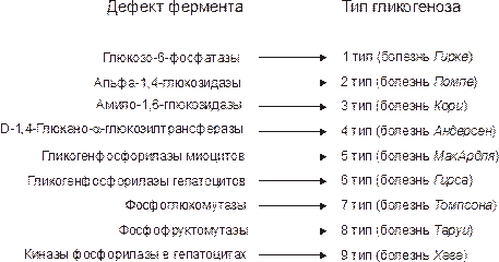 Рис. 8–5. Дефекты ферментов и основные типы гликогенозов.