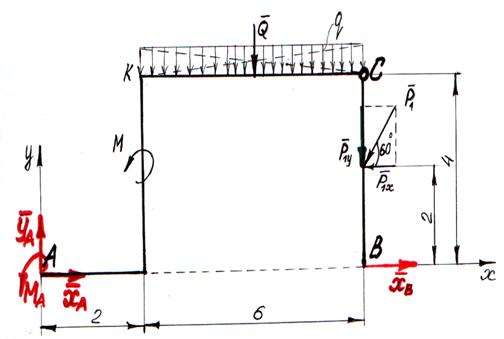 Рисунок 34 Решение: 1- й способ: Рассмотрим равновесие всей конструкции (рис. 35) Равномерно – распределённую нагрузку интенсивностью q заменяем равнодействующей Сосредоточенную силу P1х = P1 ∙ cos600 =2 ∙ (½) = 1 кН P1у = P1 ∙ sin600 = 2 ∙ ( Применяя принцип освобождаемости от связей отбрасываем опору А (жесткая заделка) и опору В (невесомый стержень) и заменяем их реакциями опор (рис. №2). Реакции опоры А – Для полученной плоской произвольной системы сил (рис. 35) можно составить три уравнения равновесия: ∑ Fкх = 0; Xв + Xа – P1х = 0; (1) ∑ Fку = 0; Yа – Q – P1у = 0; (2) => Yа = Q + P1у = 12 + ∑ Mа (