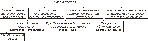 Рис. 17–6. Общие проявления метаболического атипизма в клетках опухоли. † Активное включение в метаболизм опухолей аминокислот, липидов, углеводов, ионов и других веществ (опухоль как «метаболическая ловушка»). Это обеспечивает значительно усиление (в связи с интенсивной пролиферацией бластомных клеток) пластических процессов необходимыми веществами и энергией. † Преобладание в новообразовании анаболических реакций над катаболическими. † Утрата специализации клеток новообразования по сравнению с нормальными — дифференцированными. Это связано с прекращением (или нарушением) синтеза в опухолевых клетках ряда важных для нормального метаболизма ферментов (например, глицерофосфатдегидрогеназы, что ведёт к доминированию гликолитического ресинтеза АТФ). † Снижение эффективности местной регуляции обмена веществ на основе механизма обратной связи. † «Ускользание» метаболизма новообразований от системных — нейрогенных и гормональных — регуляторных влияний. Последнее вызвано, в частности, существенными изменениями рецепторного и пострецепторного аппарата регуляции обмена в клетках бластомы. † Переход опухолевых клеток на более архаичные варианты механизмов регуляции: аутокринный (внутриклеточное управление метаболическими реакциями с помощью веществ, образуемых самой клеткой) и паракринный (управление с помощью веществ — цитокинов, образуемых соседними клетками). В целом указанные и другие проявления атипизма обмена веществ в опухоли создают условия для существенного повышения её «конкурентоспособности» и выживаемости в организме.