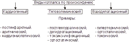 Рис. 20–6. Виды коллапсов по происхождению. • При уменьшении ОЦК развивается гиповолемический коллапс. К этому приводят: † острое массивное кровотечение, † быстрое и значительное обезвоживание организма (при профузном поносе, отравлениях, повышенном потоотделении, неукротимой рвоте); † потеря большого объёма плазмы крови (например, при обширных ожогах); † перераспределение крови с депонированием значительного её количества в венозных сосудах, кровеносных синусах и капиллярах (например, при шоке, гравитационных перегрузках, некоторых интоксикациях). • При снижение общего периферического сосудистого сопротивления развивается вазодилатационный коллапс. Это может произойти при тяжёлых инфекциях, интоксикациях, гипертермии, эндокринопатиях (при гипотиреоидных состояниях, острой и хронической надпочечниковой недостаточности), неправильном применении ЛС (например, симпатолитиков, ганглиоблокаторов, наркотиков, антагонистов кальция), гипокапнии, избытке в крови аденозина, гистамина, кининов, глубокой гипоксии и ряде др.