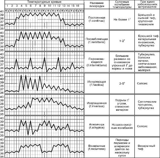 Лихорадку можно подразделять в зависимости от продолжительности, степени подъема температуры тела и особенностей ее колебаний на протяжении суток. В зависимости от продолжительности лихорадка может быть эфемерной (1-3 дня), острой (до 15 дней), подострой (до 1,5 месяца) и хронической (более 1,5 месяца). По степени подъема температуры различают лихорадку субфебрильную (37,1-37,9 °С), умеренную (38-39,5 °С), высокую (39,6- 40,9 °С) и гиперпиретическую (41 °С и выше). Последний вид лихорадки наблюдается, в частности, при столбняке и менингите. В зависимости от размера суточных колебаний температуры во вторую стадию лихорадки ее подразделяют на постоянную, послабляющую, перемежающуюся, изнуряющую, возвратную и атипичную. Следует отметить, что в большинстве случаев при развитии лихорадки сохраняется нормальный циркадный ритм колебаний температуры, т.е. вечером она выше, чем утром (рис. 11-2). Постоянная лихорадка febris continua) характеризуется высоким подъемом температуры с суточными колебаниями не выше 1 °С (крупозная пневмония, сыпной тиф и др.). Послабляющая лихорадка f. remittens) - при ней суточные колебания температуры превышают 1 °С, но снижения до нормы не происходит; такой вид лихорадки наблюдается при большинстве вирусных и многих бактериальных инфекциях (экссудативный плеврит, туберкулез и др.). Перемежающаяся лихорадка (f. intermittens) характеризуется большими колебаниями суточной температуры с падением ее по утрам до нормы или ниже (гнойная инфекция, туберкулез, некоторые разновидности малярии, ревматоидный артрит, лимфомы и др.). Изнуряющая лихорадка f. hectica) - суточные колебания температуры достигают 3-4 °С; наблюдается при гнойных процессах, сепсисе, туберкулезе и других заболеваниях. Возвратная лихорадка (f. recurrens) характеризуется чередованием лихорадочных и безлихорадочных периодов, длительность ко-